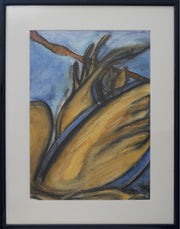 Juvenile Swan is a lively abstract watercolor painting created with watercolor and charcoal on paper, beautifully framed in a navy-blue wooden frame with glass protection by Frontispiece Framers. This artwork captures the vitality and spirit of young swans as they explore, learn, and grow in their natural environment.