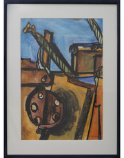This abstract watercolor painting merges loose washes of color with bold charcoal lines, creating a piece full of contrast and character. The technique reflects both the permanence of industrial structures and the fluidity of the dock waters, resulting in an artwork that feels both grounded and dynamic.