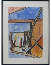 Old Dock Crane is a striking abstract watercolor painting created with watercolor and charcoal on paper, framed in a wooden navy-blue frame with glass protection by Frontispiece Framers. Inspired by the artist’s local dock, this piece captures the enduring presence of old shipping cranes, preserved as symbols of the once-thriving dockside industry.