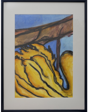 Swan Energy is a vibrant abstract watercolor painting created with watercolor and charcoal on paper, elegantly framed in a navy-blue wooden frame with protective glass by Frontispiece Framers. This fine piece of art celebrates the sheer energy of swans as they glide, interact, and fill our waterways with life.